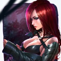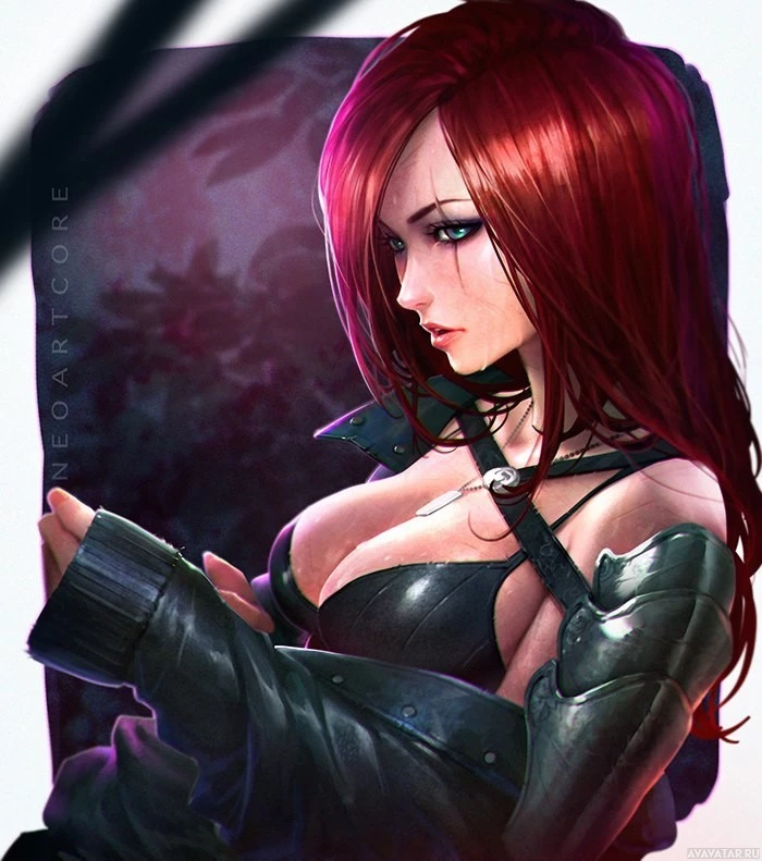 a female character with red hair, wearing a black and red outfit that appears to be armor or a costume. She is holding her