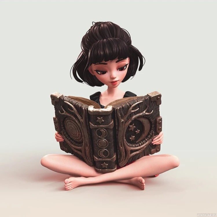 На картинке присутствует 3D-анимационный персонаж девушки с чёрными волосами, сидящей и читающей книгу. Обстановка, по-видимому, является студийным фоном, что предполагает, что это может быть анимационный фильм или сериал.