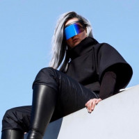 short hair and are wearing sunglasses, which reflect the bright light, suggesting it might be daytime. There's also a piece of headwear that covers their ears and neckline, contributing to the overall