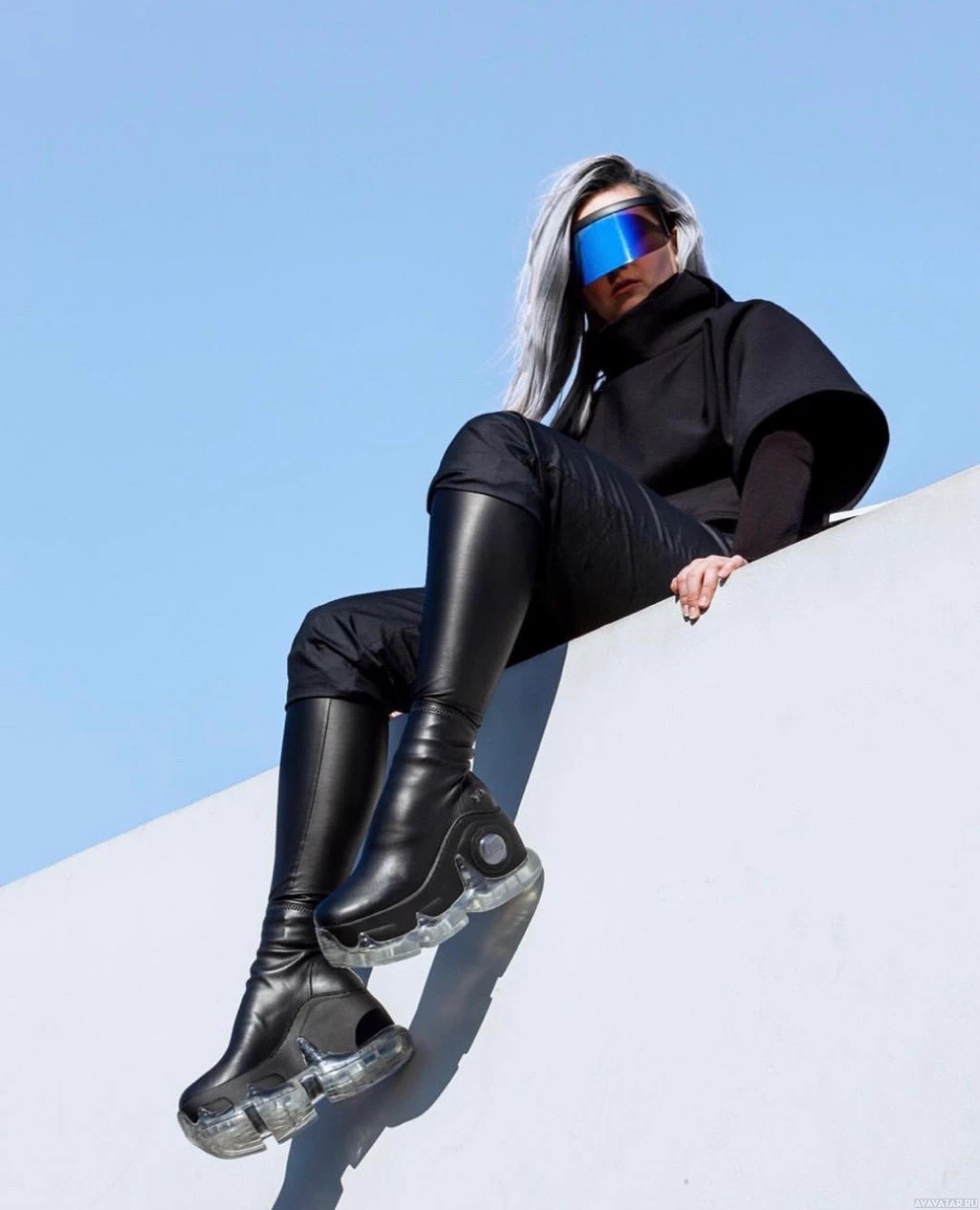 leather boots and pants, along with a high-top boot that appears to be part of an athletic or combat-style outfit. They have