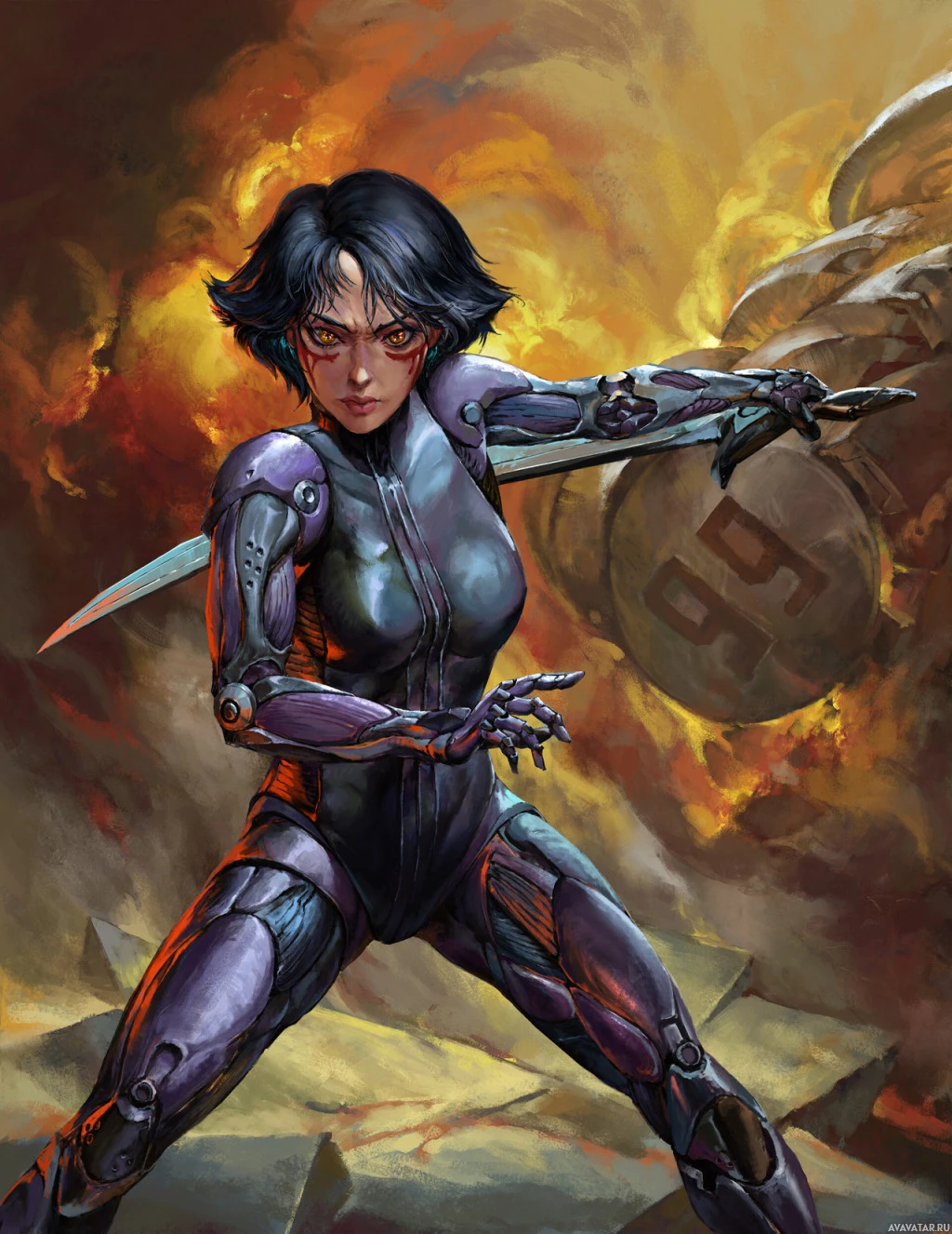 combat stance. She appears to be in an urban or post-apocalyptic setting, with elements that suggest she might be engaged in battle or protecting her territory. The background includes flames and debris, which adds to