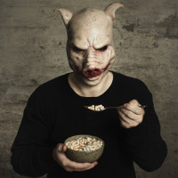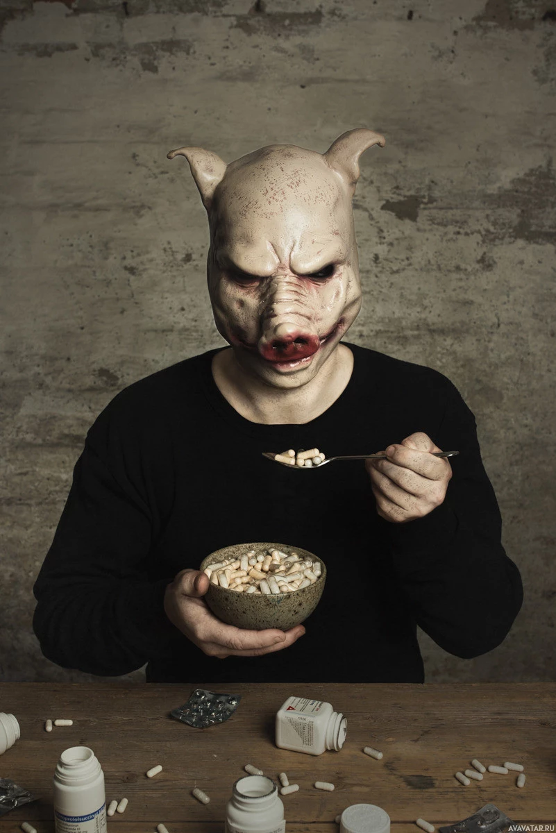 The image depicts a person wearing a mask that resembles the face of a pig. This individual is sitting at a table and appears to be eating from a bowl, which could be food or perhaps something else given the context of this unusual image. The presence of what seems to be prescription medication