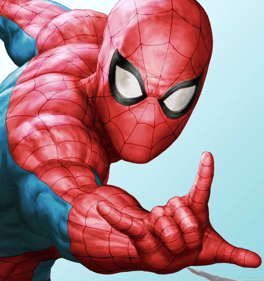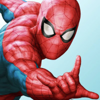 a dynamic pose with his hands outstretched as if he's ready to swing or stop something. The character is known for his spider-themed costume and the iconic