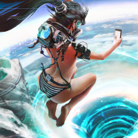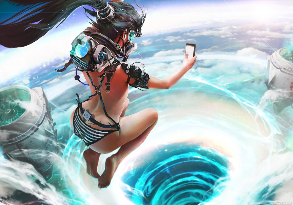dark hair and a fantasy design. She is floating in the air while holding a smartphone, seemingly taking a selfie or interacting with it. Around her are elements like clouds,