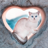 На картине изображена белая кошка с голубыми глазами, сидящая в очертаниях отверстия в форме сердца. Кошка, кажется, смотрит прямо в камеру, давая чувство любопытства или интереса к своему окружению.