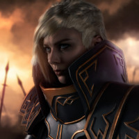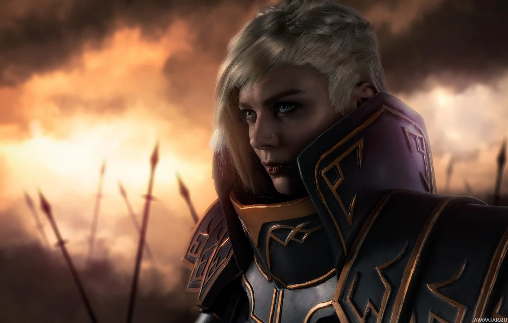 The image features a character from the game Diablo. This is a cosplay of one of the characters in the Diablo series, portrayed by a person dressed to resemble that character's appearance.