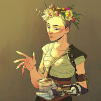 protective gear over a black dress, indicating she might be part of a fantasy or adventure-themed story. The character is holding a cup that could possibly contain tea, suggesting