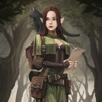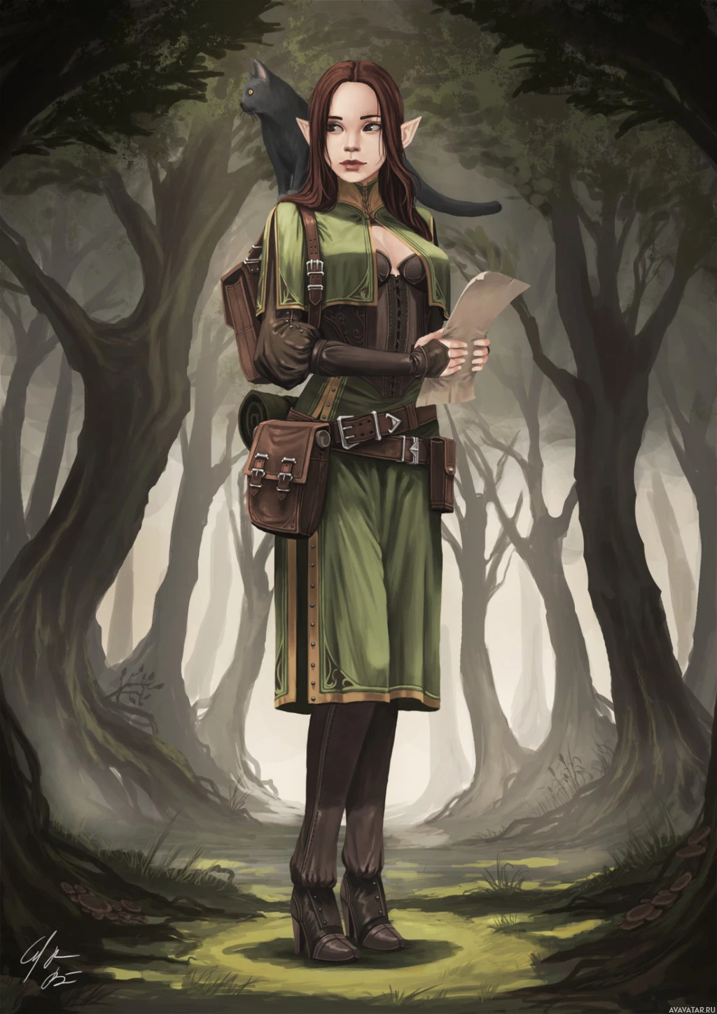 her on the ground, possibly indicating she is accompanied by a familiar or a pet. The character holds a scroll or document in her hand, suggesting she may be on a mission or involved in some form of task that requires reading from the scroll. The overall atmosphere is one of mystery and adventure, fitting within a fantasy genre context.