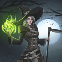 a witch hat and holding a staff with a glowing green energy at the top, which could be interpreted as a magical spell or power. There is also