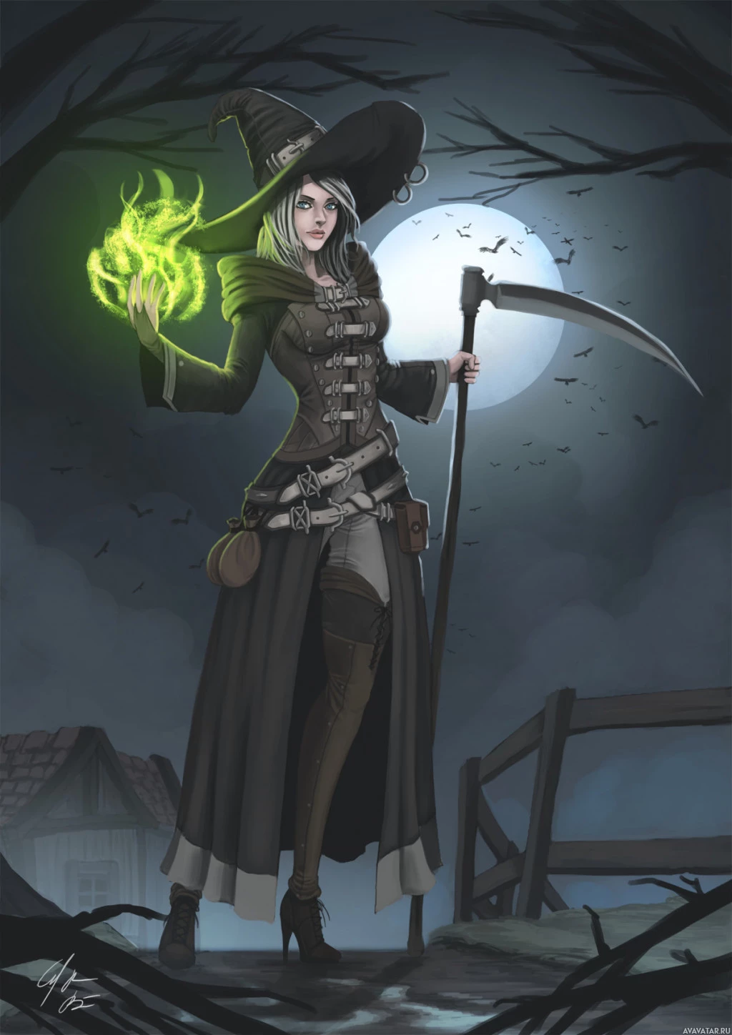 The image depicts a fantasy witch standing on