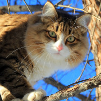 На снимке изображен пушистый длинноволосый кот, сидящий на ветке дерева. Кошка кажется настороженной и смотрит вверх или в сторону с поднятыми ушами.