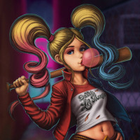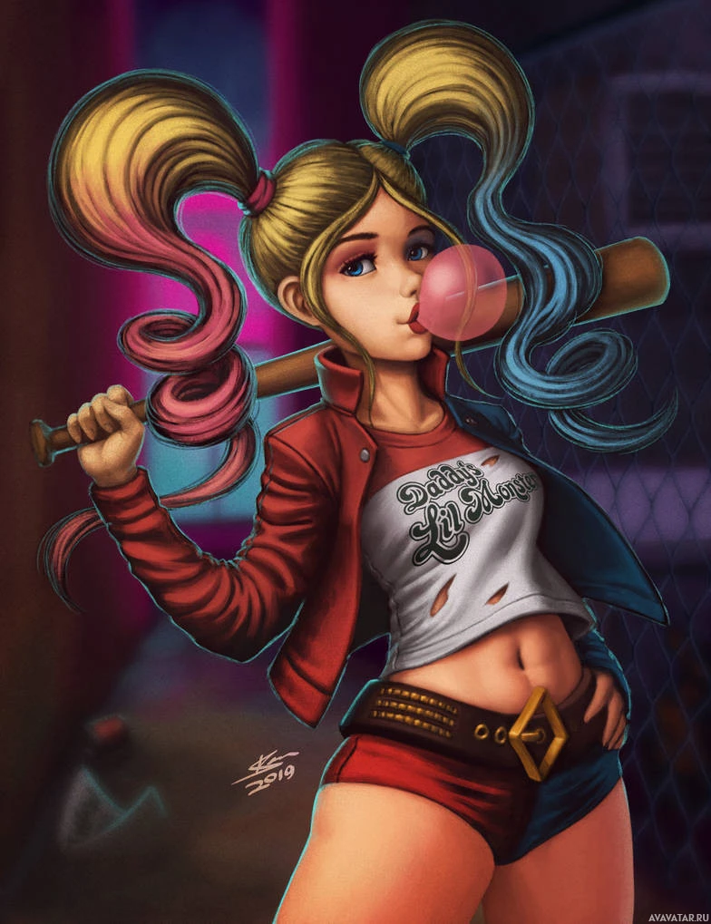 blonde hair styled in bangs and two-toned hair (pink and blue), wearing a red jacket, and holding a baseball bat that has been repurposed as a weapon. Harley Quinn is known for her role as the Joker's girlfriend and partner in crime, often portrayed as a clown-themed antihero with