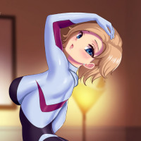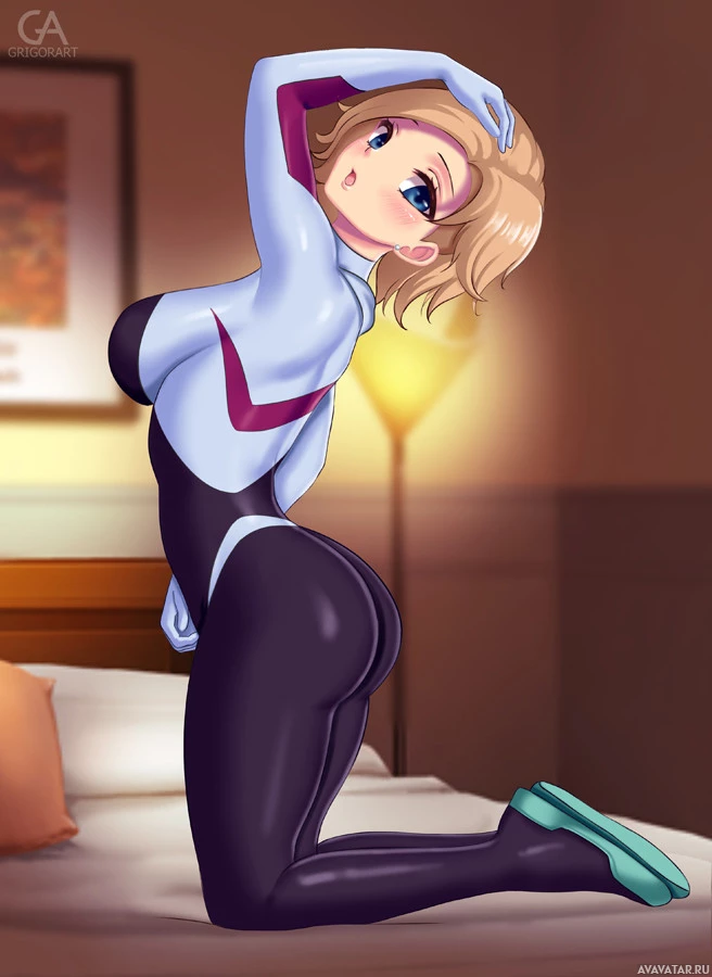 an animated character that appears to be Gwen Stacy from a comic or animation, depicted in a playful and exaggerated pose. She is dressed in a black and red costume with what seems to be