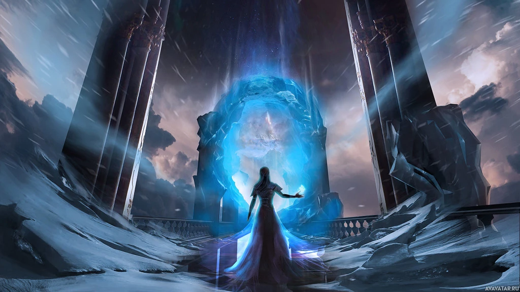 a storytelling environment, likely from a game or fantasy literature, given the elements such as the archway and the portal. There is no specific girl in a dress visible; rather, it seems to be a character within the context of this