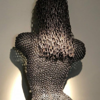 art piece where the artist has used found objects or unconventional materials to create a human-like form. The style is abstract and lacks