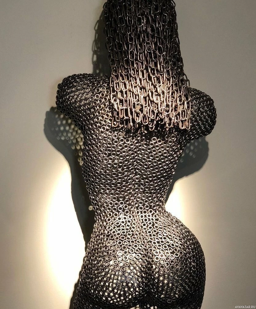 The image shows a sculpture from behind, which appears to be made of interconnected pieces that form the shape of