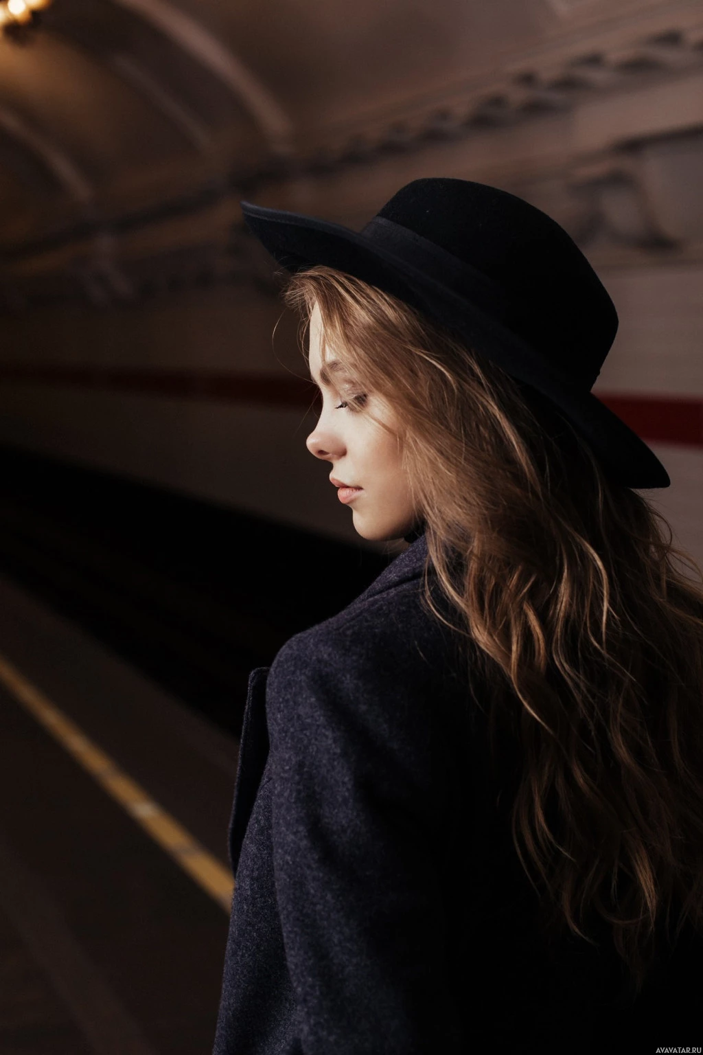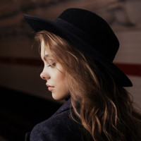 a young woman standing on a train platform. She is looking off into the distance, and her gaze seems contemplative or thoughtful. Her hair is long and it cascades down over her shoulders. She's wearing a hat and has on