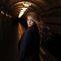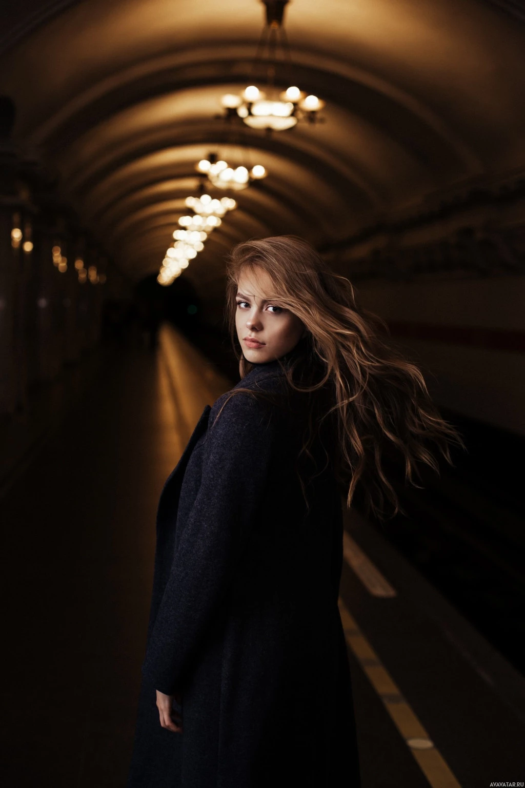 a dark coat and her hair appears to be blowing slightly due to movement, suggesting she might have been walking towards the camera. The environment looks modern with fluorescent lighting overhead and a well-lit platform visible behind her.