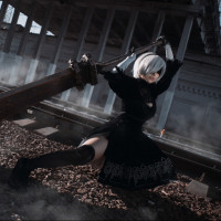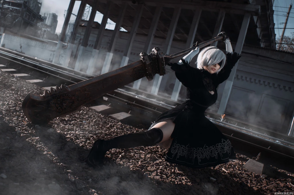 a dynamic pose, as if she's attacking or fighting with a sword. The setting appears to be a dilapidated industrial area, possibly a train track, with smoke and steam visible around her feet, adding to