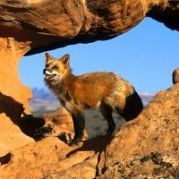 rock formations and red rock canyons. The fox is facing towards the camera, and its mouth is slightly open, which might suggest that it's yawning, panting, or displaying