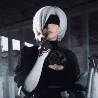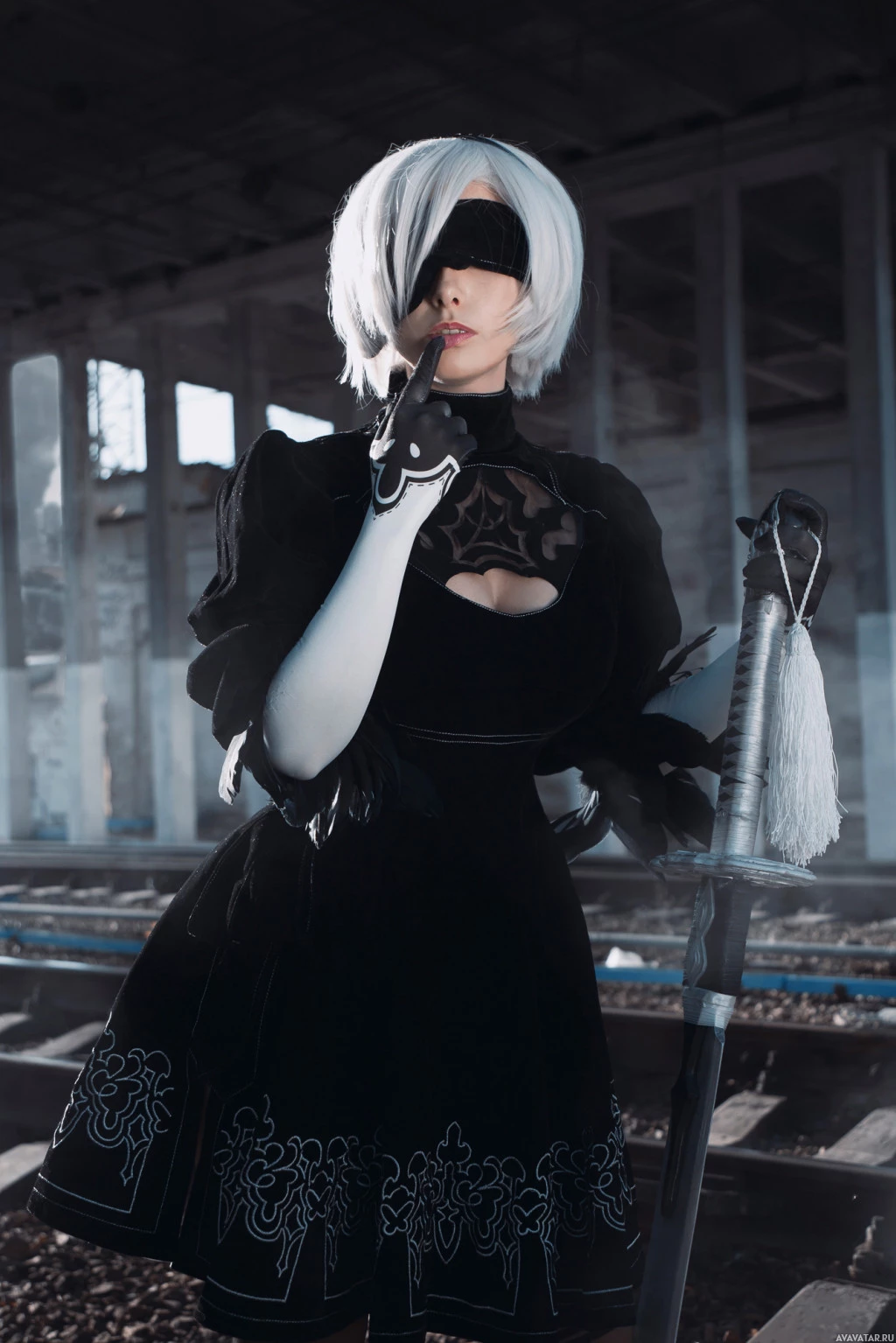 The image features a character dressed in costume, resembling the game "Nier: Automata." She is wearing