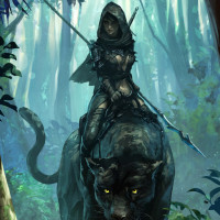 the back of a panther through what appears to be a magical or mythical forest. She is wearing armor and carrying a lance, which suggests she might be a knight or a warrior. The girl's attire includes a hood, adding