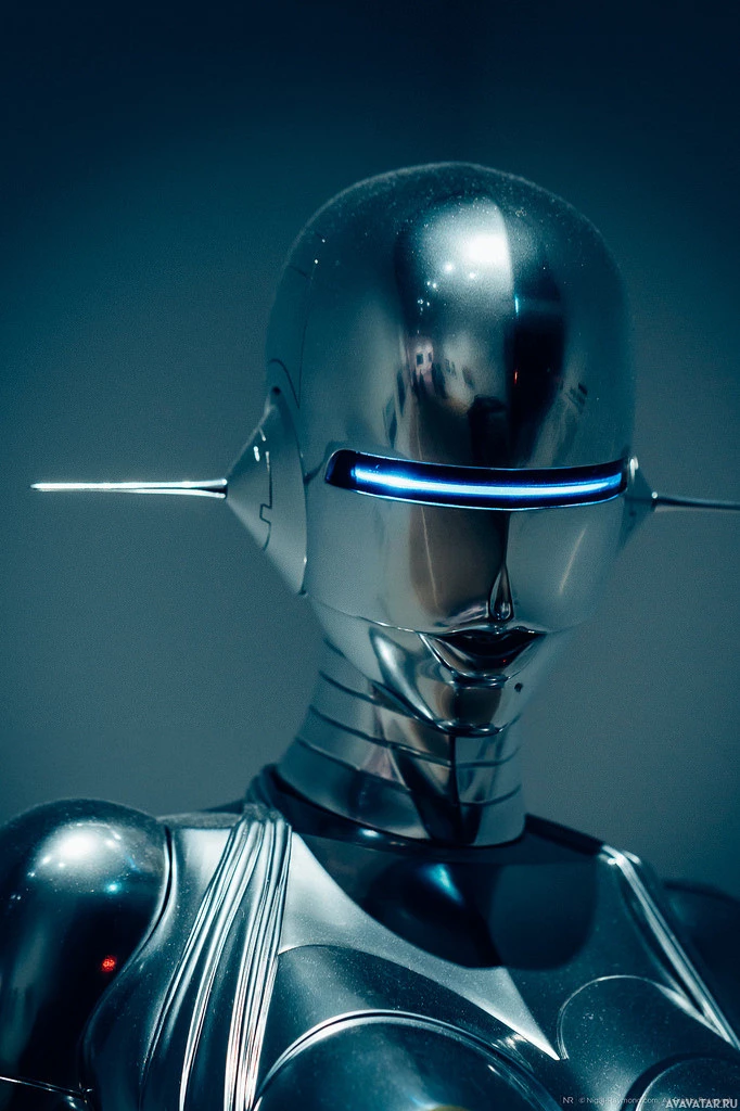 На снимке изображен человекоподобный робот. Он имеет металлическое тело с головой, которое, по-видимому, предназначено для взаимодействия с человеком, возможно, с датчиками или камерами, встроенными в структуру. Цветовая схема в основном серебристая и черная, и на том, что можно интерпретировать как глаза или другие функциональные области, есть синие огни. Дизайн предполагает уровень сложности в искусственном интеллекте или робототехнике.