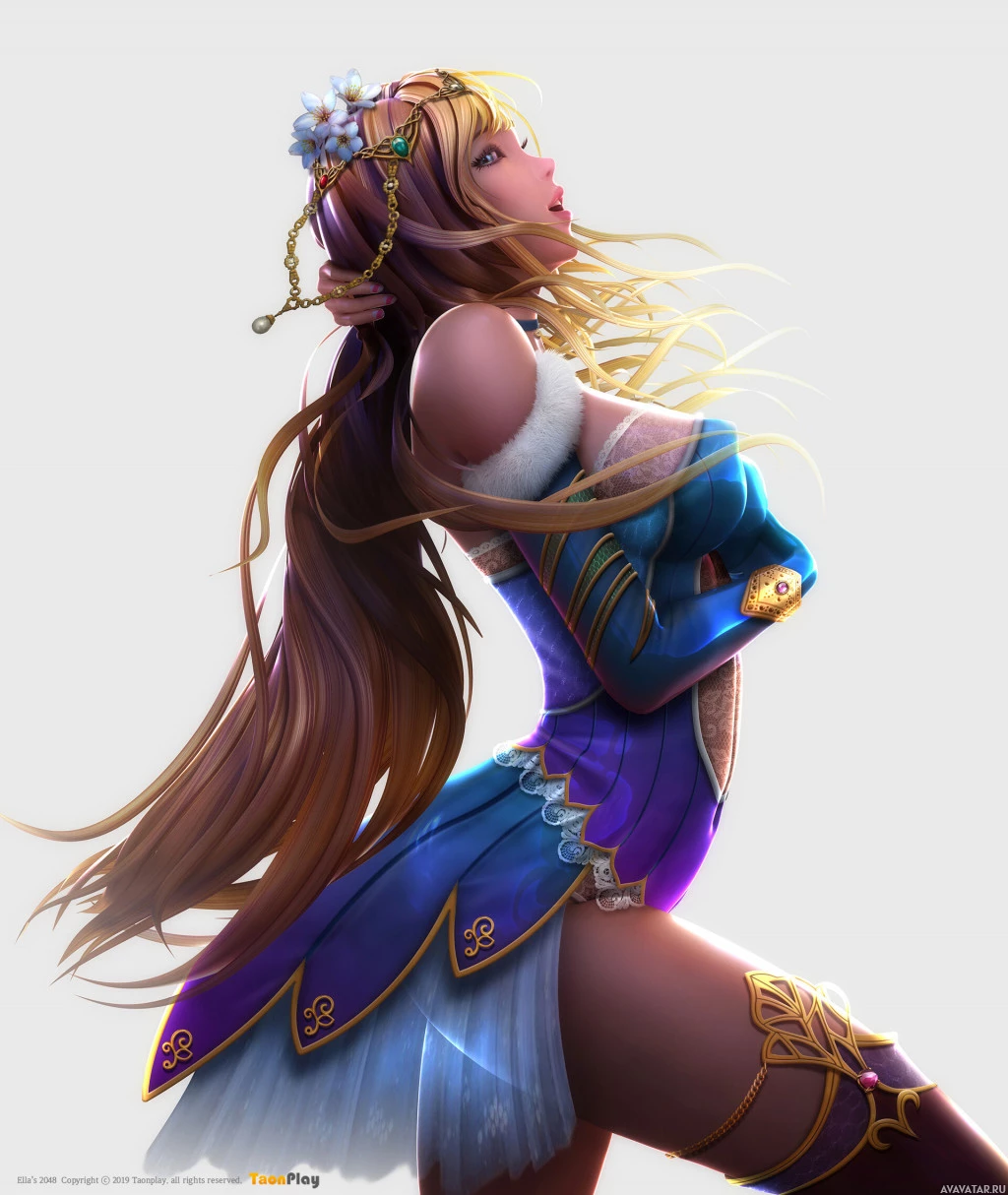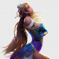 Картинка показывает персонажа, который появляется из мультсериала или игры. У нее длинные светлые волосы, и она носит подробный костюм, который включает в себя то, что выглядит как доспехи с замысловатыми конструкциями, предполагая, что это может быть жанр фэнтези. Ее выражение созерцательно или, возможно, грустно, когда она смотрит в сторону.