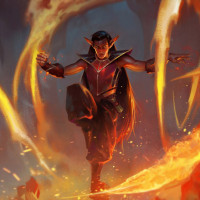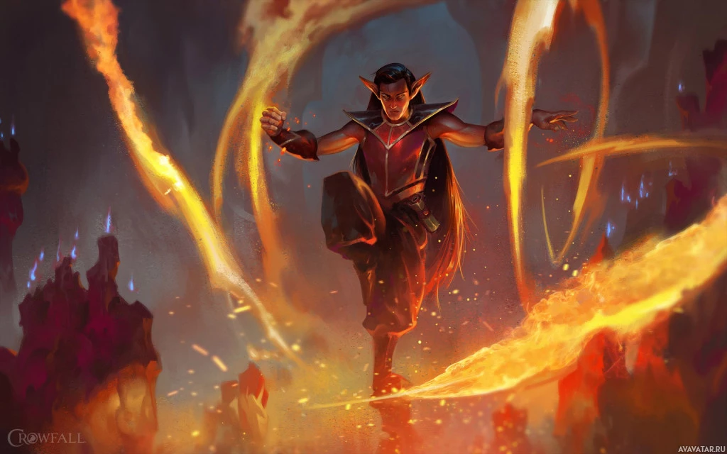 На картинке изображен иллюстрированный персонаж фэнтези, который кажется эльфом. Эльф стоит в драматической позе с пламенем, окружающим их руки и ноги, предполагая, что они бросают или контролируют огонь. Это произведение искусства подпадает под категорию фэнтези-тематических образов.