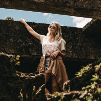 На картинке изображена молодая женщина, стоящая среди некоторых руин, которые находятся в древнем городе или археологическом памятнике. Она носит солнцезащитные очки и вытянула руку вверх, указывая на что-то в небе над ней. Расположение, кажется, имеет историческое значение, возможно, место с богатой историей.