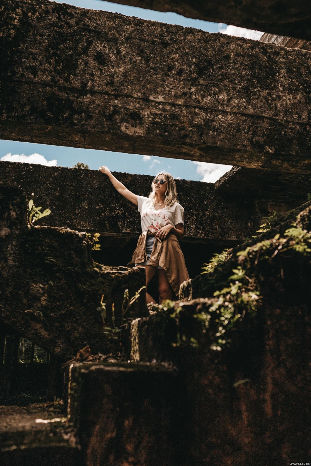 In the image, there is a young woman standing amidst some ruins that appear to be in an ancient city or archaeological site. She is wearing sunglasses and has her arm extended upwards, pointing at something in the sky above her. The setting seems to have historical significance, possibly a location with a rich history.