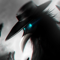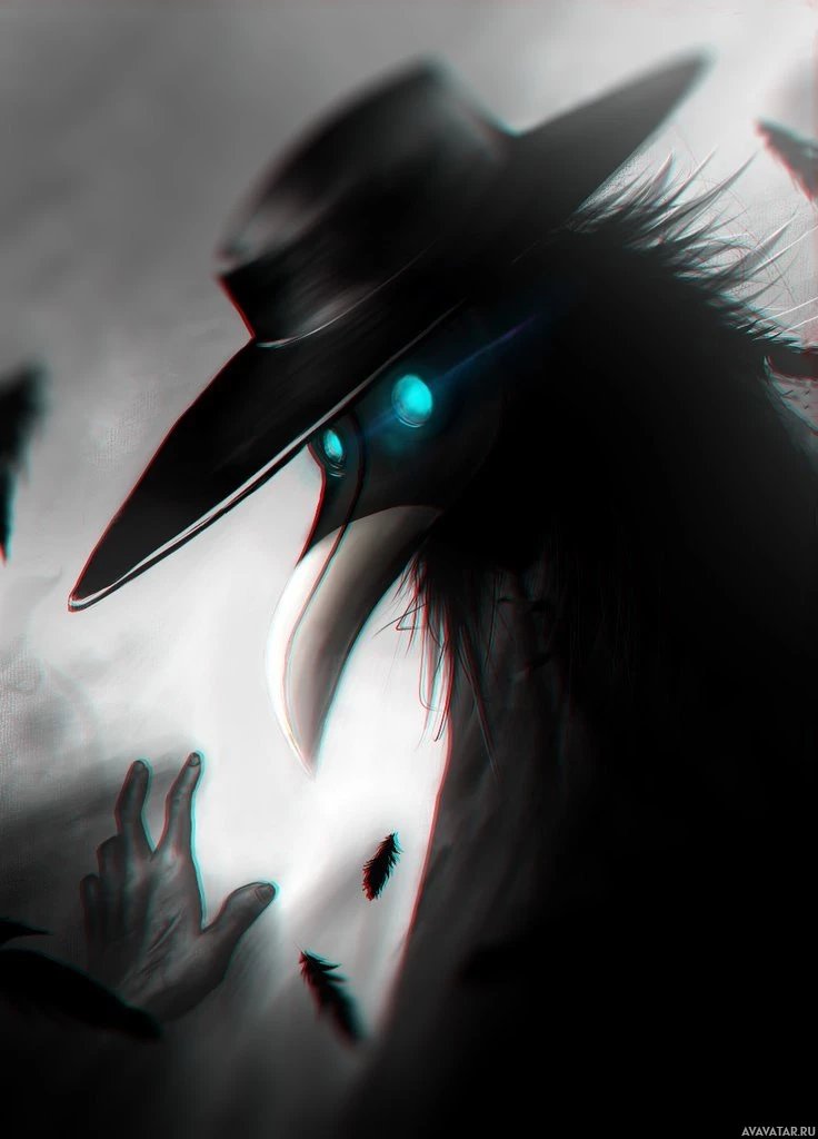 a dark background, giving it an ominous or mysterious vibe. The mask itself has a hollowed-out space where the beak would normally be, and it's paired with