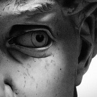 На картинке изображена статуя головы человека. По-видимому, это вид крупным планом, фокусирующийся на особенностях лица, таких как глаза и нос. Статуя имеет подробное выражение, правый глаз более заметен, чем левый. Стиль статуи предполагает, что она могла быть из классической древности.