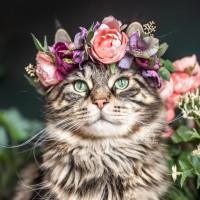 На картинке изображен кот, одетый в цветочную корону на голове. На заднем плане розовые и фиолетовые цветы, которые дополняют естественную настройку фотографии. Кошка выглядит спокойной и ухоженной, с аккуратно вычесанным мехом и расслабленным выражением лица.