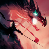 The image features a fantasy-themed scene. A warrior stands to the left, holding a lance and facing towards a dragon that is located on the right side of the image. The background has a dark, misty appearance with hints of red, suggesting an intense or fierce