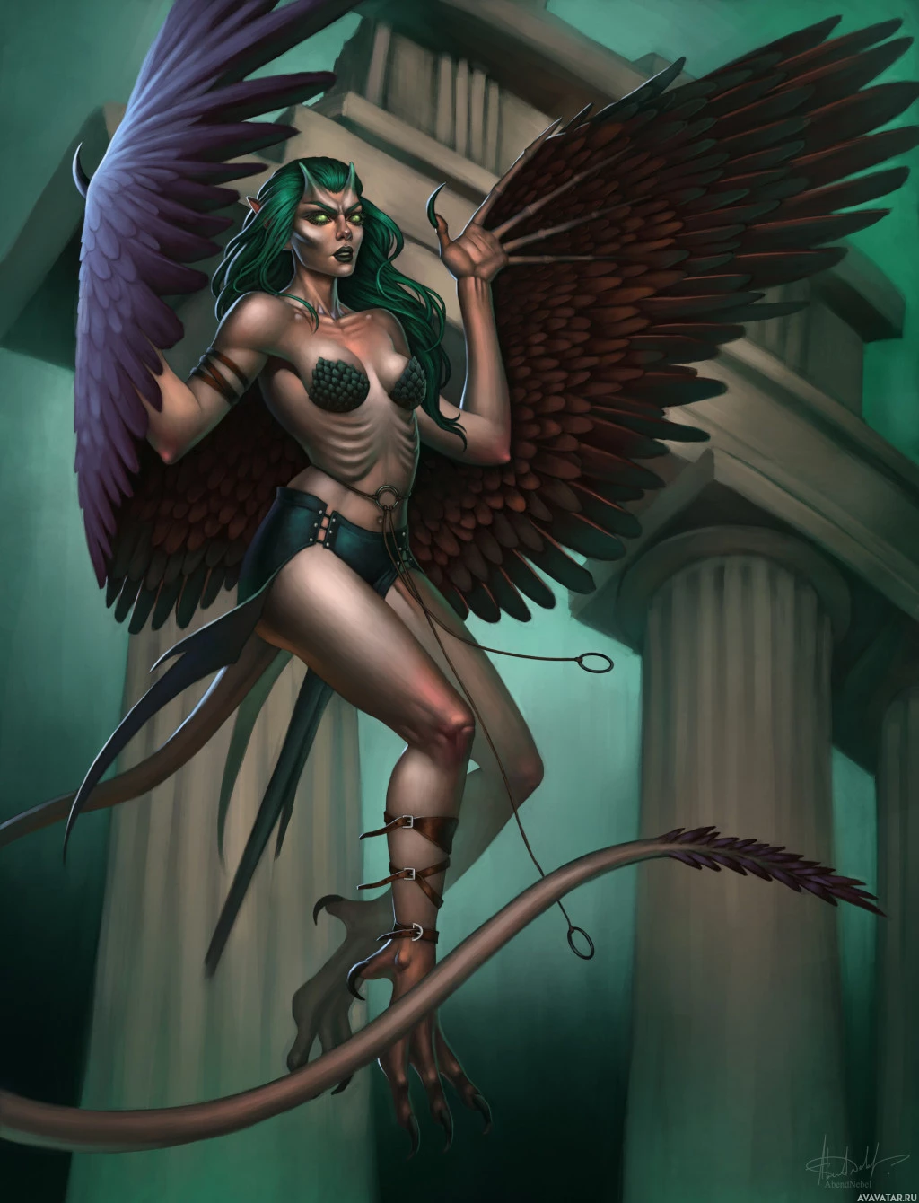 a fantasy character that appears to be a harpy. This creature is often portrayed in mythology and folklore as having the upper body of a bird, typically with wings, and the lower