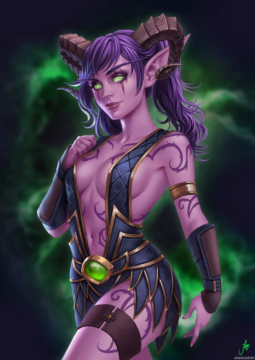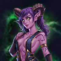 a fantasy character that appears to be a Draenei from the Warcraft universe. The character has purple skin, pointed ears resembling those of an elf or dragon, and distinctive eye markings that are commonly associated with the Draenei species in