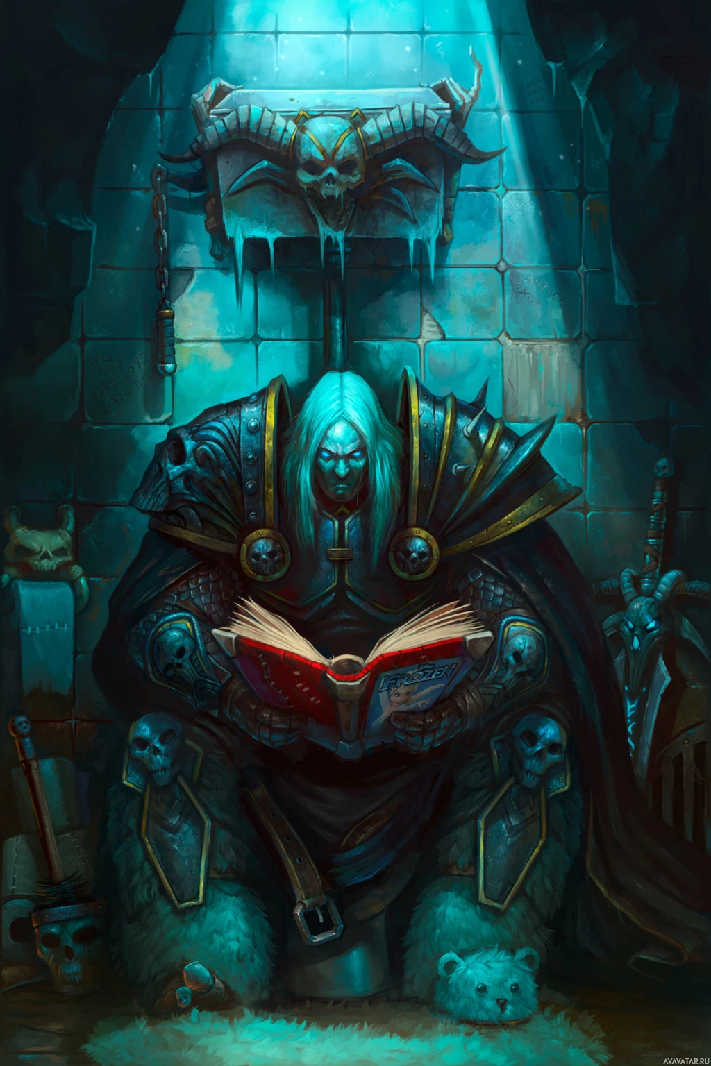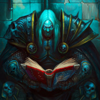 a stone chamber or dungeon, reading a book. Above them are two skulls with horns, which suggests a connection to death or the undead. The ambiance of the image is moody and mystical, fitting for