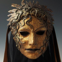 a face mask with a distinct design. It appears to be a piece of historical or cultural significance, possibly inspired by ancient Greek art, as indicated by the snake motif which is reminiscent of Greek