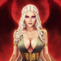 silver hair styled in loose waves and is holding a dragon's egg, symbolizing her association with dragons. The background has