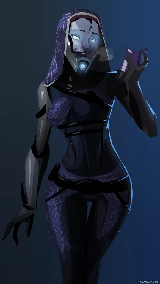 blue skin and advanced technology that includes mechanical enhancements to her body, which are part of her Quarian race's biological augmentations. In this particular illustration or