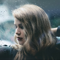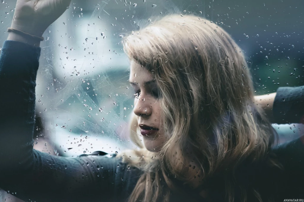 На снимке изображена молодая женщина со светлыми волосами. Она, кажется, смотрит из дождливого окна, ее глаза закрыты, как будто в созерцании или, возможно, слушая дождь. Ее поза и выражение лица предполагают момент самоанализа или, возможно, грусти из-за погоды.
