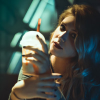 a blurred background, holding what appears to be a drink in her hand. She is looking slightly away from