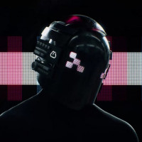 The image appears to show a person wearing an advanced, possibly futuristic headgear or mask. This could be interpreted as representing a robotic or technologically enhanced human in a science fiction context. The background features a graphical overlay with neon-like digital elements that suggest a high-tech environment.