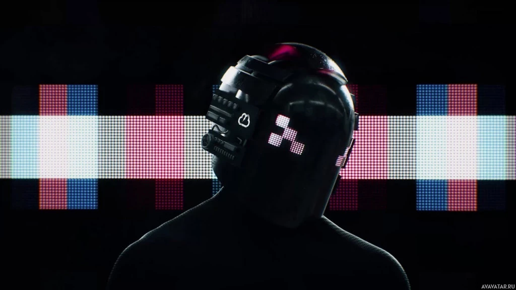 Картинка показывает человека, носящего продвинутый, возможно футуристический головной убор или маску. Это может быть интерпретировано как представление робота или технологически усовершенствованного человека в контексте научной фантастики. Фон имеет графическое наложение с неоновыми цифровыми элементами, которые предполагают высокотехнологичную среду.