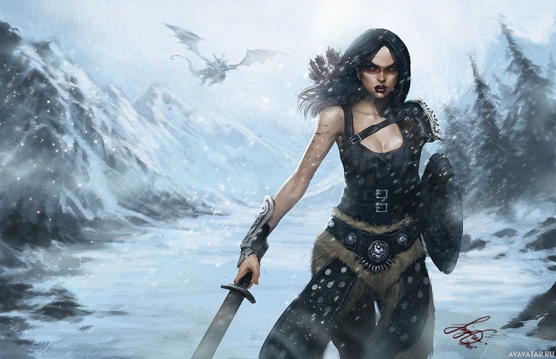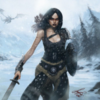 a brunette woman with an intense expression, standing in what seems to be a snowy landscape with mountains in the background. She is holding a sword and wearing armor or leather clothing that suggests she might be a warrior or adventurer. The art style indicates this could be from