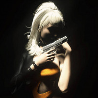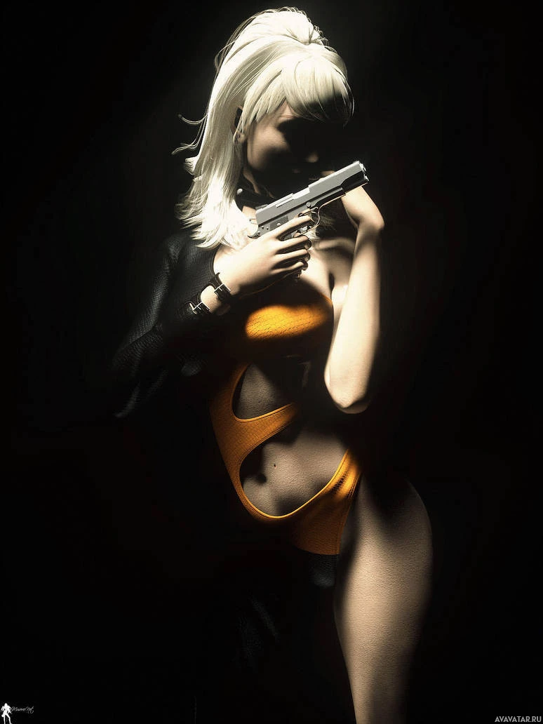 female character with white hair, wearing a revealing outfit. She is holding a pistol in her right hand and appears to be either aiming it or examining it closely. The overall tone of the image is dark and moody, suggesting a narrative or thematic context that may involve action, espionage, or crime elements.