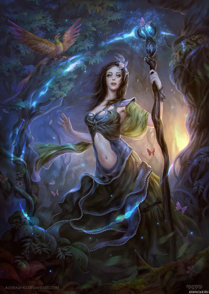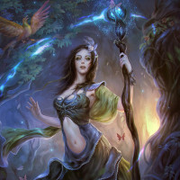 a female character in a forest setting. She is adorned with what appears to be magical or enchanted elements, such as a staff or wand she holds aloft in one hand and a cloak that seems to glow with