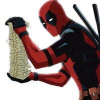 sense of humor and tendency to break the fourth wall. In this picture, Deadpool is depicted holding a wad of money in one hand while pointing at it with the other, suggesting a scene related to finance or wealth.