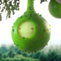 a whimsical scene with green, frog-like creatures hanging upside down from the branches of trees. These creatures have